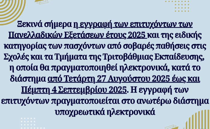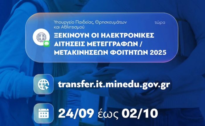 ΣΗΜΑΝΤΙΚΗ ΑΝΑΚΟΙΝΩΣΗ Για πρώτη φορά, οι αιτήσεις μετεγγραφής και μετακίνησης ξεκινούν νωρίτερα από κάθε άλλη χρονιά. Από σήμερα Τέταρτη 24 Σεπτεμβρίου 2025 έως και Πέμπτη 2 Οκτωβρίου 2025, οι φοιτητές...